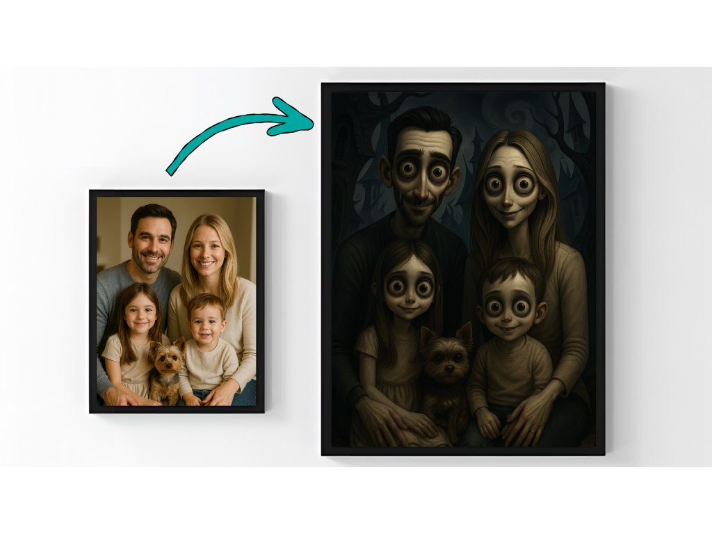 Vstup do snového světa, kde se temnota prolíná s krásou. Plakát ve stylu Temné fantazie zachycuje charakteristickou gotickou atmosféru – bledé postavy, výrazné kontrasty, dlouhé stíny a jemně morbidní estetiku, která působí poeticky i mysteriózně. Každý detail vypráví vlastní příběh o emocích, osamění i kouzlu jinakosti.